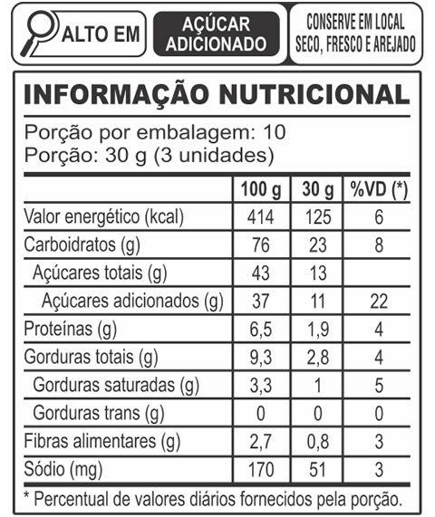 Farinha de trigo enriquecida com ferro e ácido fólico, goiabada (polpa de goiaba, açúcar, acidulante INS 330 e conservador INS 211), açúcar, margarina (contém óleo de soja transgênico*), amido*, ovos, composto lácteo, fermentos químicos INS 500(ii) e INS 341 (i), antiumectante INS 170 (i).). *(Geneticamente modificados a partir de Agrobacterium tumefaciens e/ou Bacillus thuringiensis e/ou