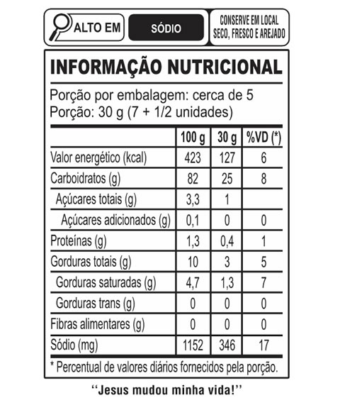 Polvilho azedo, ovos, gordura de palma, composto lácteo, amido. (Geneticamente modificado a partir de Agrobacterium tumefaciens e/ou Bacillus thuringiensis e/ou Streptomyces viridochromogenes e/ou Zea mays), sal.