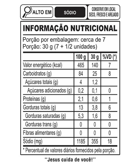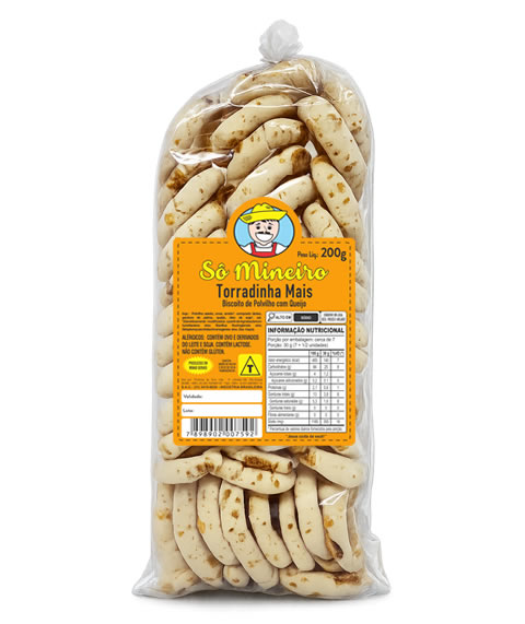 Polvilho azedo, ovos, amido*, composto lácteo, gordura de palma, queijo, óleo de soja*, sal. *(Geneticamente modificados a partir de Agrobacterium tumefaciens e/ou Bacillus thuringiensis Streptomyces viridochromogenes e/ou Zea mays).