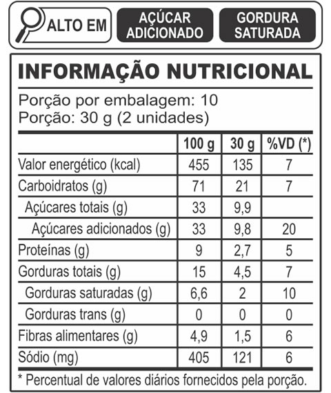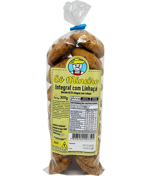 Farinha de trigo integral, açúcar, margarina (contém lecitina e óleo de soja transgênicos*), ovos, semente de linhaça, aromatizante, fermento químico (amido*, fermentos químicos INS 500(ii) e INS 341(i), antiumectante INS 170 (I).). *(Geneticamente modificados a partir de Agrobacterium tumefaciens e/ou Bacillus thuringiensis e/ou Sreptomyces viridochromogenes e/ou Zea mays).